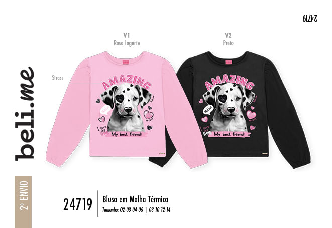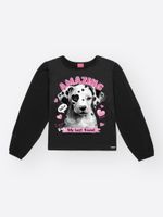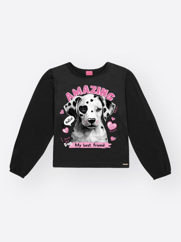 O grande destaque da peça fica por conta da sua estampa exclusiva, que traz um adorável cãozinho dálmata em técnica de sublimação, enriquecida com delicados pontos de strass que adicionam um brilho sofisticado e moderno. O design conta ainda com mangas longas levemente franzidas no ombro e punhos com elástico, conferindo um volume romântico e atual à silhueta. Detalhes minuciosos, como a plaquinha de metal personalizada da marca, reforçam o DNA premium da peça.