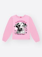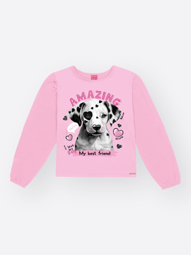 O grande destaque da peça fica por conta da sua estampa exclusiva, que traz um adorável cãozinho dálmata em técnica de sublimação, enriquecida com delicados pontos de strass que adicionam um brilho sofisticado e moderno. O design conta ainda com mangas longas levemente franzidas no ombro e punhos com elástico, conferindo um volume romântico e atual à silhueta. Detalhes minuciosos, como a plaquinha de metal personalizada da marca, reforçam o DNA premium da peça.