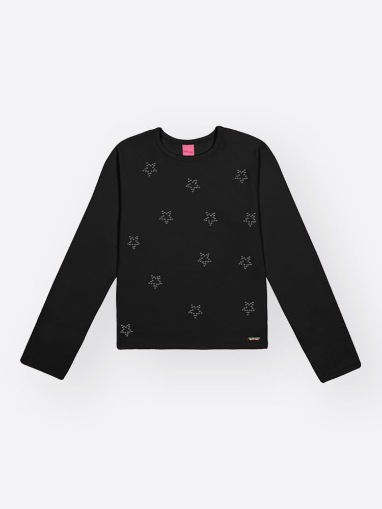 O design minimalista é transformado pela aplicação frontal de strass formando estrelas, que proporciona um brilho sutil e encantador, perfeito para iluminar o visual de forma moderna. Com mangas longas, gola redonda clássica e acabamento impecável com a plaquinha de metal exclusiva da marca, a peça une a durabilidade do algodão à sofisticação que as pequenas fashionistas adoram.