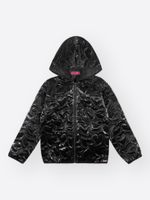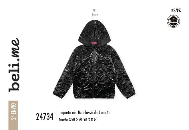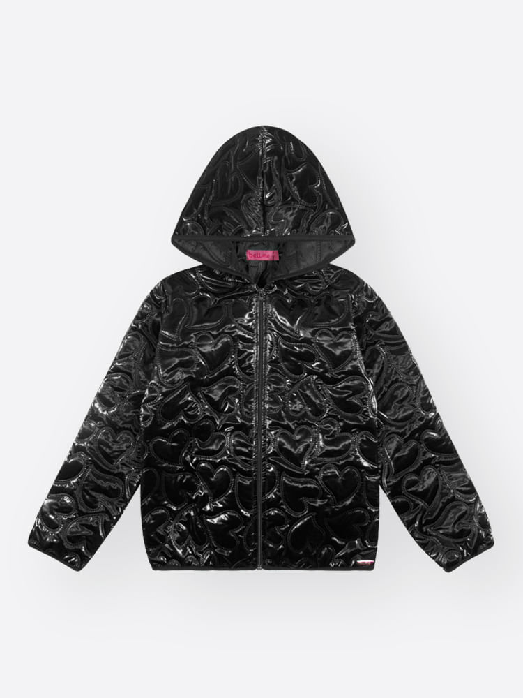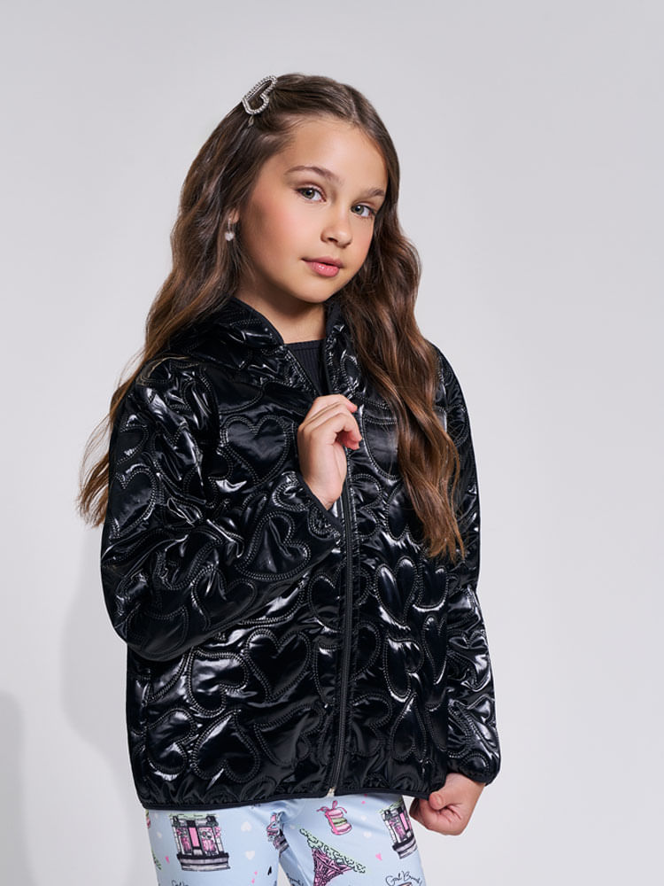 "Esta jaqueta da Beli.me é a peça statement indispensável para compor looks de inverno com uma pegada glam e sofisticada. Confeccionada em matelassê de coração, o tecido apresenta um acabamento brilhante e acolchoado que une proteção térmica a um design de alta moda infantil. A peça possui modelagem com cava normal, capuz com recorte e fechamento frontal em zíper de nylon, garantindo um caimento impecável e funcional para o dia a dia.