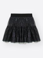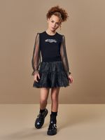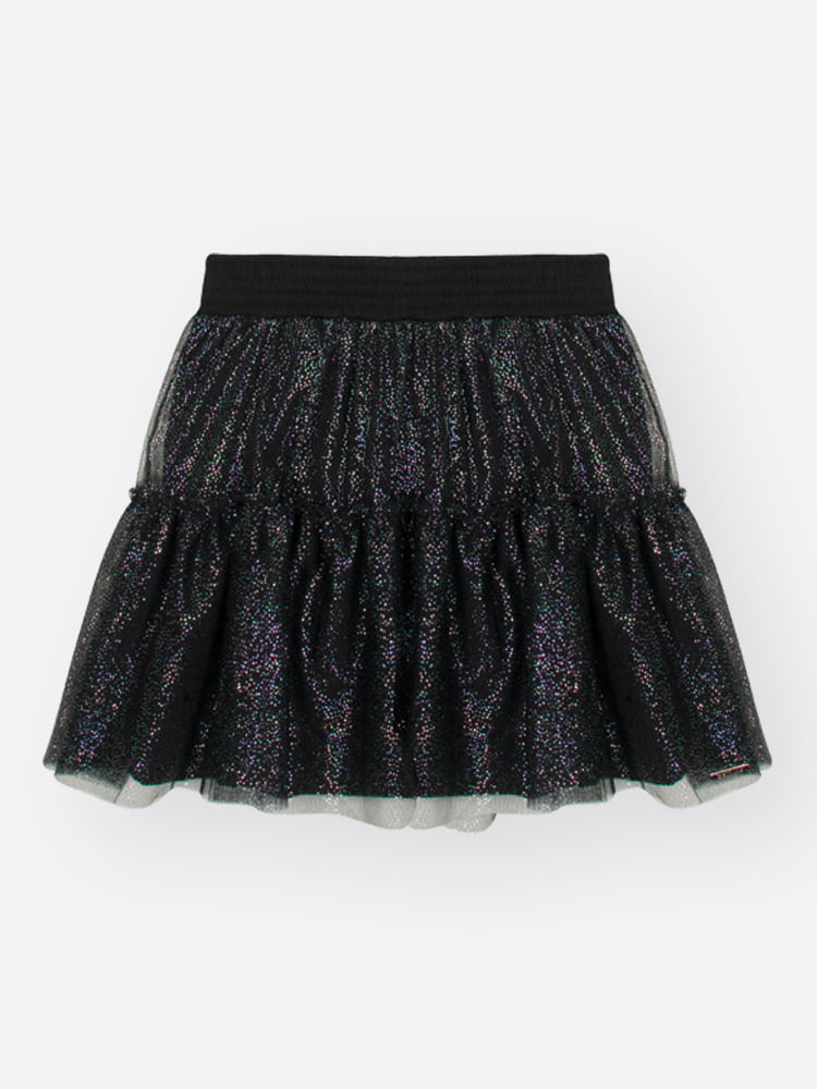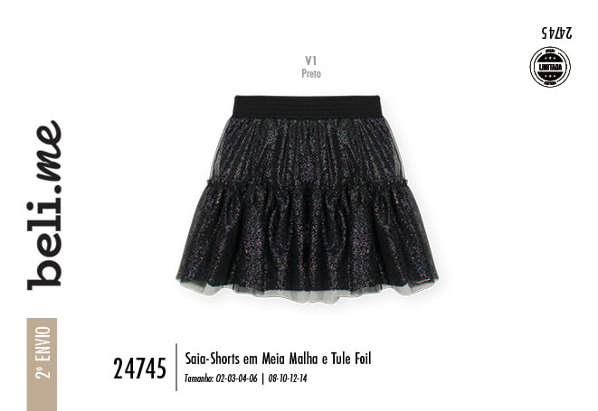 "Esta Saia-Shorts Beli.me é a união perfeita entre o lúdico e o fashion, projetada para meninas que não abrem mão do estilo e do conforto em suas aventuras. Confeccionada em uma base de meia malha macia, a peça garante liberdade total de movimentos, enquanto a sobreposição em tule foil adiciona um volume encantador e um brilho sofisticado.