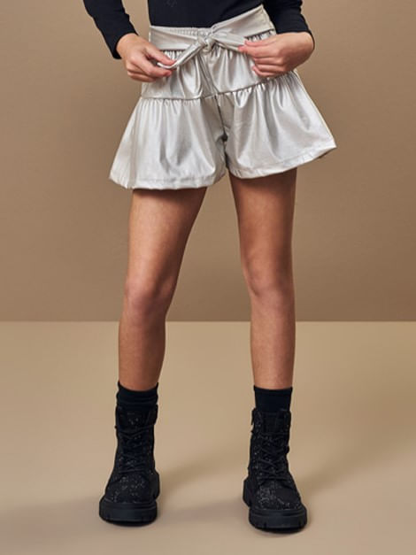 "Este Shorts em PU da Beli.me é a escolha ideal para quem busca unir o brilho do mundo fashion ao conforto essencial da moda infantil. Confeccionado em material sintético premium (PU), a peça apresenta um visual moderno e estruturado que remete ao couro, garantindo um toque de sofisticação imediato ao look das meninas.