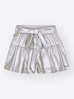 O design destaca-se pelo corte com recorte franzido, que proporciona um volume delicado e movimento à peça, assemelhando-se a uma saia-short. O cós rebatido com elástico assegura um ajuste prático e confortável, complementado por uma elegante faixa talhada presa nas laterais para amarração frontal e passantes que finalizam o acabamento com primor. Livre de estampas, o modelo foca na textura lisa e no brilho característico do tecido, sendo adornado apenas por uma discreta plaquinha de metal decorativa.