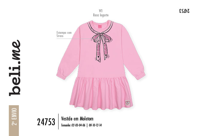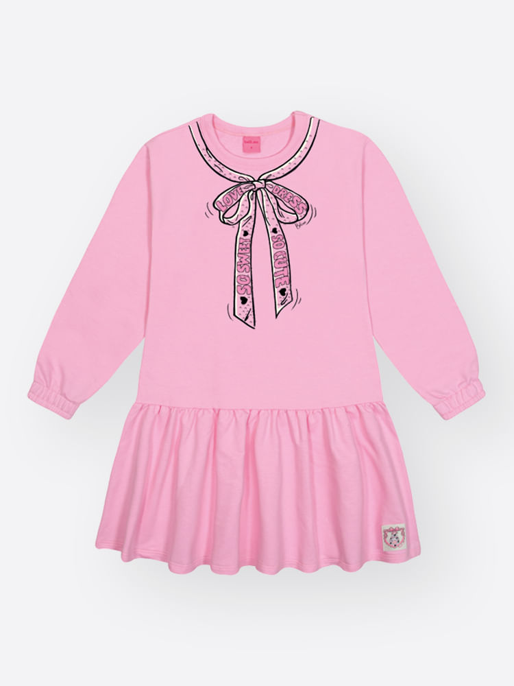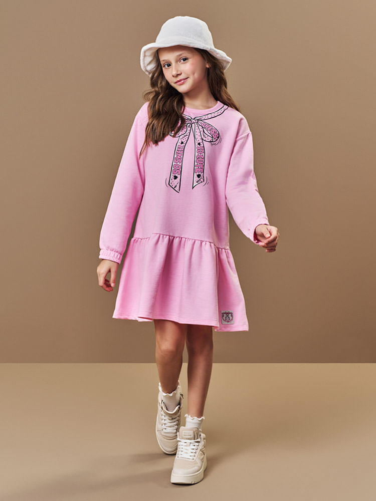 Com uma modelagem de comprimento rodado, o vestido apresenta um recorte com franzido na saia que cria um movimento gracioso e fluido. O design prioriza o conforto com mangas longas de cava levemente deslocada e punhos finalizados com elástico rebatido, garantindo um ajuste seguro e delicado. O grande destaque fashion fica por conta da estampa centralizada, que simula um laço sofisticado adornado com aplicações de strass, trazendo um brilho sutil e moderno à peça. Finalizando o design com exclusividade, o modelo conta com uma etiqueta decorativa aplicada próxima à barra.