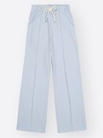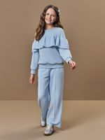 Para uma produção ""fashionista mirim"", combine este conjunto com tênis de solado alto ou modelos estilo plataforma. Como a calça wide leg possui um volume característico, ela harmoniza perfeitamente com coletes puffer ou jaquetas jeans mais curtas. Adicionar um headphone ou uma ecobag estilizada completa o visual urbano com muita atitude.