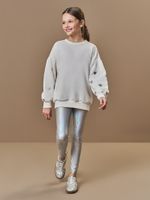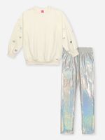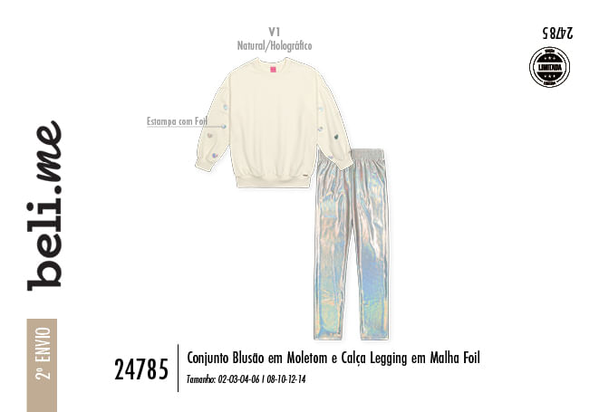 "Este conjunto infantil feminino da Beli.me é a escolha perfeita para pequenas fashionistas que buscam um visual de impacto com o máximo de conforto. A composição une um blusão em moletom premium, conhecido pelo seu toque macio e excelente caimento, a uma calça legging em malha foil holográfica, que traz o brilho tecnológico e as cores mutáveis que são febre na moda internacional. O blusão apresenta detalhes sofisticados, como a cava deslocada acompanhada de franzidos delicados e punhos talhados com acabamento franzido, criando um volume romântico e moderno.