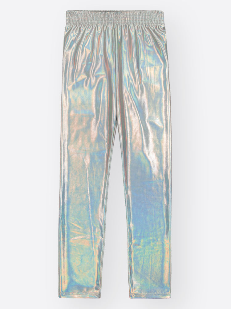 Para um look cyber-cool, combine o conjunto com tênis de cano alto ou modelos com solado translúcido. Como a calça legging holográfica já é o ponto focal da produção, aposte em acessórios neutros ou de acrílico para manter a estética moderna. Em dias mais gelados, um casaco estilo puffer transparente ou prateado completa o visual com maestria fashionista.