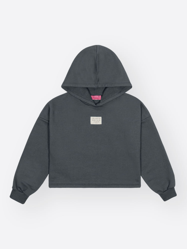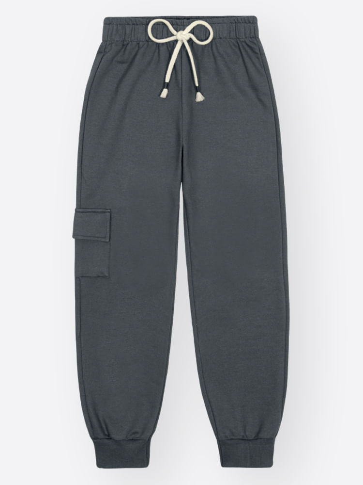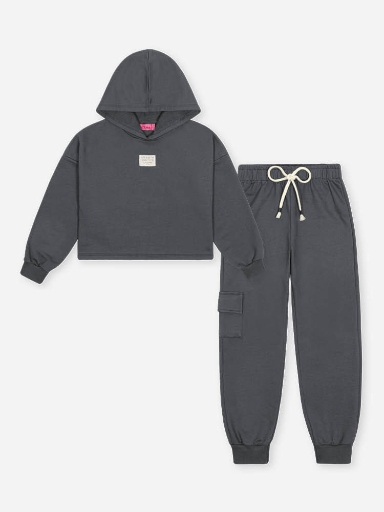 O conjunto é desenvolvido em moletom de toque macio, priorizando a liberdade de movimento sem perder a sofisticação. O blusão com um caimento estruturado e mais curto, possui capuz com recorte e cava deslocada, que conferem um visual despojado e contemporâneo. O acabamento em punho talhado e a etiqueta decorativa centralizada elevam o design da peça. Já a calça jogger, apresenta um cós elástico rebatido para ajuste seguro e um charmoso cadarço fake com linha de entremeio. O grande destaque fica para o bolso sobreposto com lapela dupla, que traz um toque utilitário super em alta na moda infantil.