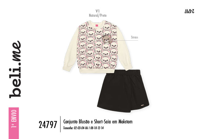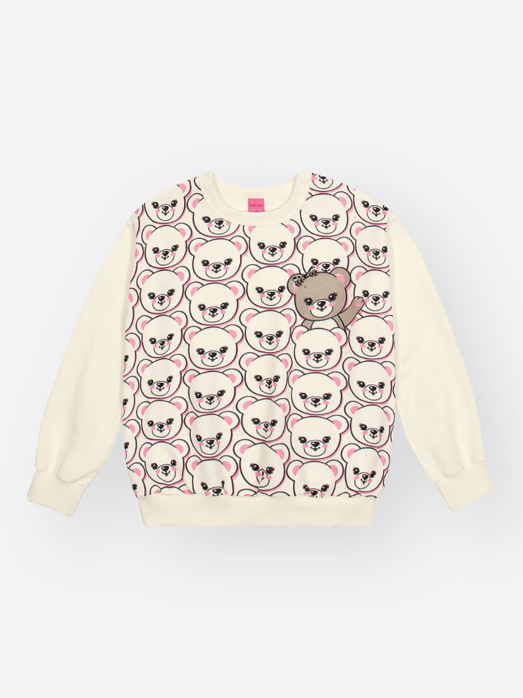 O destaque visual fica por conta da estampa rotativa em sublimação com rostinhos de ursinhos, que ganha um toque de sofisticação com a aplicação estratégica de strass. Detalhes premium, como os acabamentos em ribana talhada nos punhos e barra e a plaquinha de metal exclusiva, elevam o status fashion da produção.