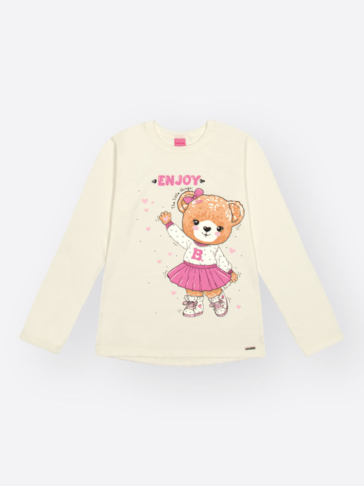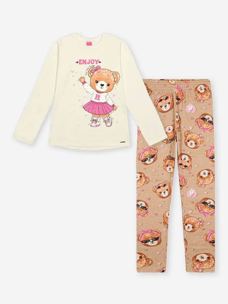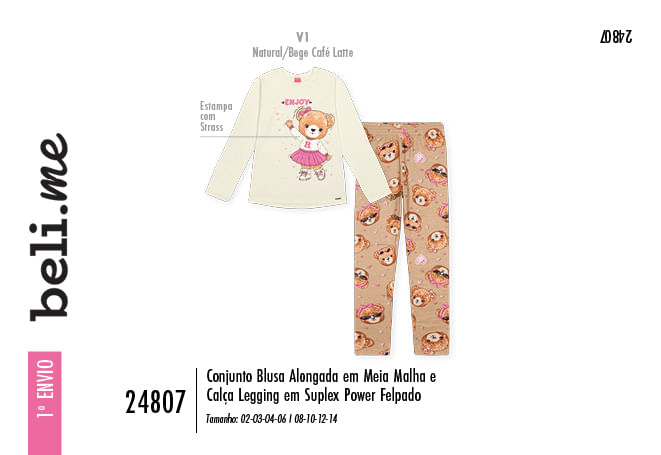 "O conjunto da marca Beli.me é a escolha estratégica para quem busca o equilíbrio perfeito entre o visual fashion e o máximo conforto na moda infantil de inverno. Composto por uma blusa alongada confeccionada em meia malha e uma calça legging em suplex power felpado, o look garante proteção térmica e um toque macio sobre a pele, ideal para o dia a dia das meninas. O design se destaca pela sofisticação da estampa frontal de ursinha com aplicação de strass e uma delicada plaquinha de metal, que confere um brilho especial à peça. Para completar o visual de forma harmônica, a calça apresenta uma estampa rotativa de ursinhas feita em sublimação rolo, trazendo modernidade e diversão ao conjunto que veste dos tamanhos 02 ao 14.