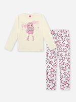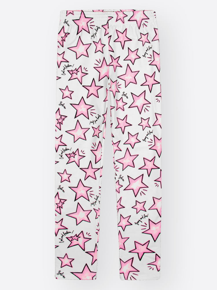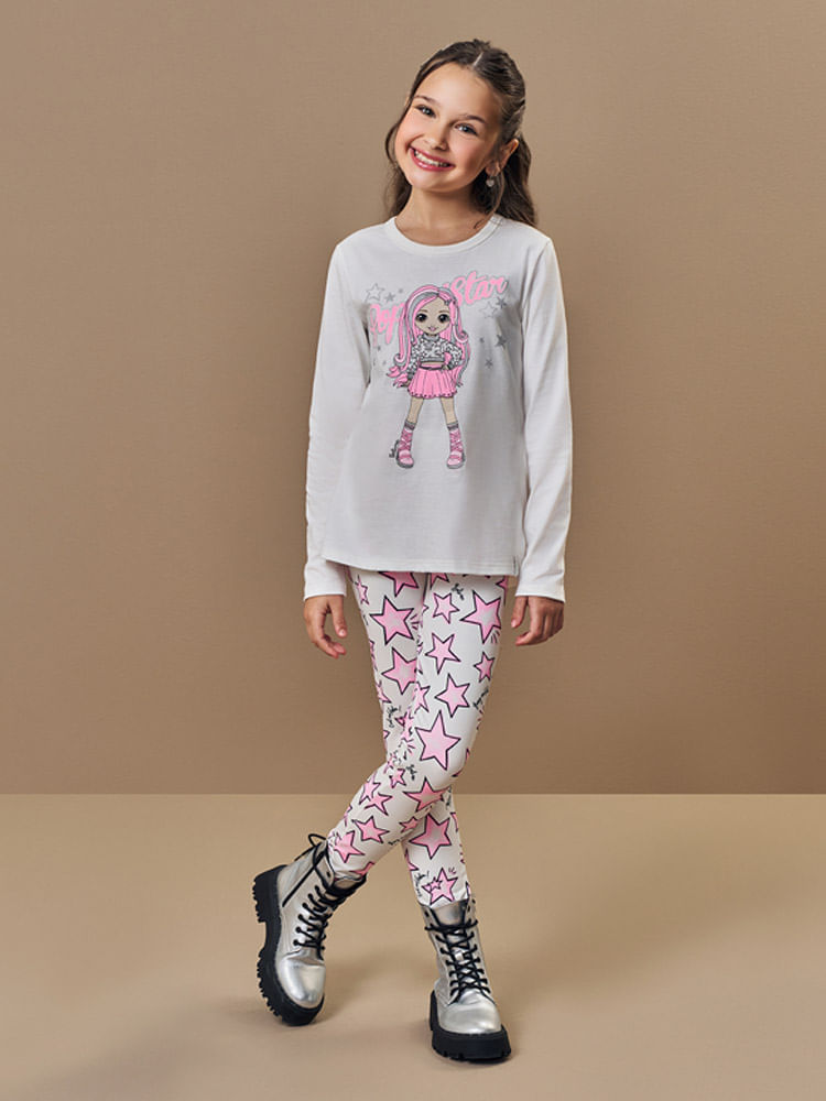 O design destaca-se pela blusa com estampa frontal localizada, que recebe um acabamento especial em super prata e glitter, conferindo um brilho fashion e sofisticado. Para harmonizar, a calça legging apresenta uma estamparia corrida de estrelas em sublimação, criando um conjunto visualmente dinâmico e divertido. Detalhes como a etiqueta decorativa reforçam o cuidado e a identidade premium da marca.