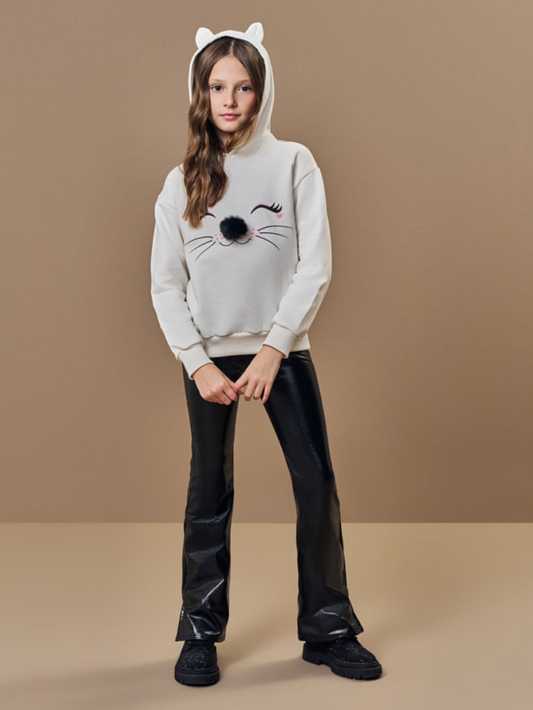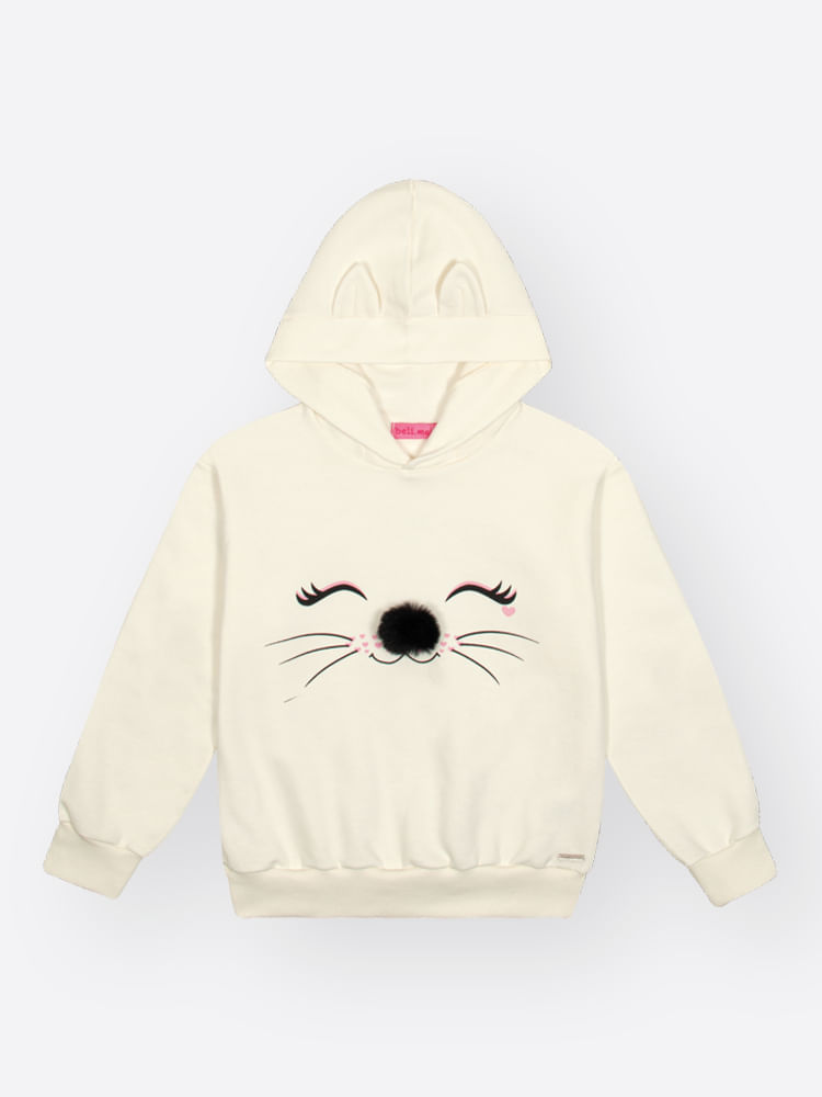 O design encantador destaca-se pelos detalhes interativos: o blusão possui um capuz com recorte de orelhas de gato embutidas e uma estampa frontal delicada que ganha vida com a aplicação de um pompom no nariz do personagem. A calça boot cut, com sua modelagem levemente aberta na barra e acabamento em glitter, traz o toque fashionista necessário para elevar o visual. O acabamento premium é garantido pela plaquinha de metal exclusiva da marca.