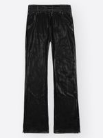 Combinação: Para um visual sofisticado, combine com uma bota de verniz ou um coturno estiloso. Se a ideia for um look mais casual e urbano, um tênis slip-on com glitter harmoniza perfeitamente com a proposta da calça.