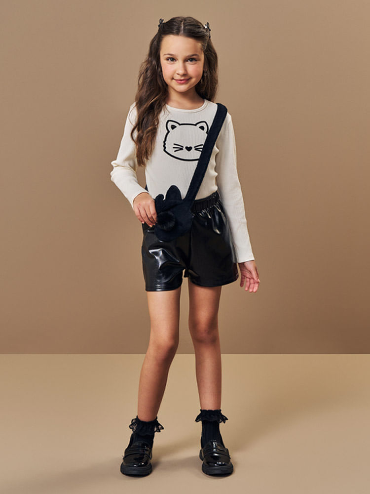O design ganha um ar lúdico e fashionista com a estampa em flocado na blusa, que oferece uma textura aveludada única. Para elevar a experiência de uso, o conjunto acompanha uma bolsa em pelo com forro em meia malha, detalhada com orelhas 3D e pompom, tornando o visual interativo e irresistível para as pequenas. A qualidade premium é selada pela tradicional plaquinha de metal da marca.