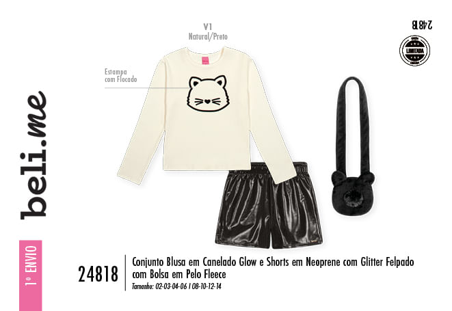 "Este conjunto da Beli.me é a escolha definitiva para unir glamour e diversão no guarda-roupa de inverno. O look apresenta uma blusa em canelado glow, que proporciona um brilho sutil e sofisticado, combinada a um shorts em neoprene com glitter felpado, garantindo estrutura moderna e um toque interno quentinho e macio.