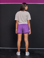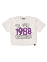 Blusa cropped juvenil feminino em meia malha com estampa frontal com relevo e etiqueta decorativa na bainha. Inverno 2024. Modelo veste tamanho 18 e possui 1,62 de altura.