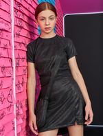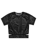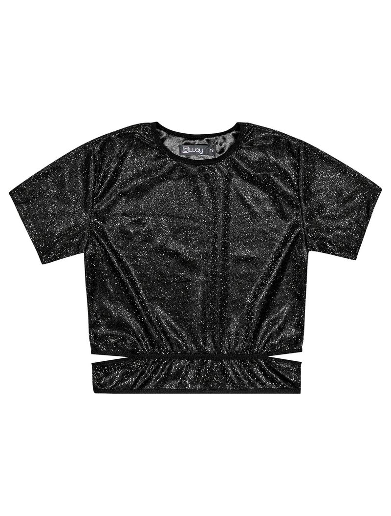 Blusa cropped juvenil feminino em malha glow com abertura lateral e elástico na gola e cintura. Inverno 2024. Modelo veste tamanho 18 e possui 1,62 de altura.