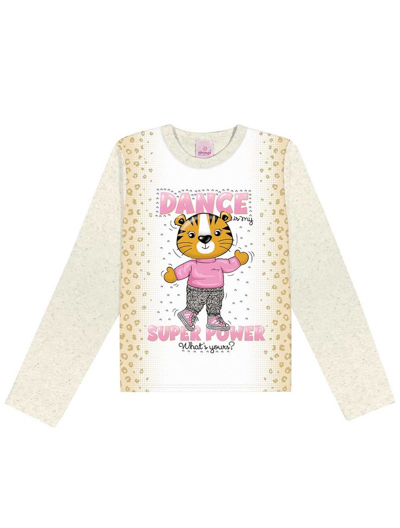 Camiseta em meia malha com estampa frontal com strass e etiqueta decorativa na manga. Coleção Inverno 2023. Modelo veste tamanho 6. Tradução da estampa: Dança é meu super poder. Qual é o seu?