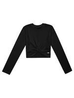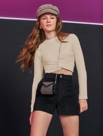 Blusa juvenil feminino em malha suede com gola, detalhe de torção frontal e plaquinha decorativa acima do detalhe. Inverno 2024. Modelo veste tamanho 18 e possui 1,65 de altura.
