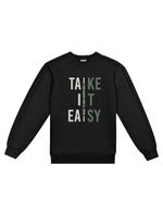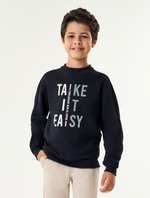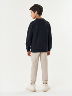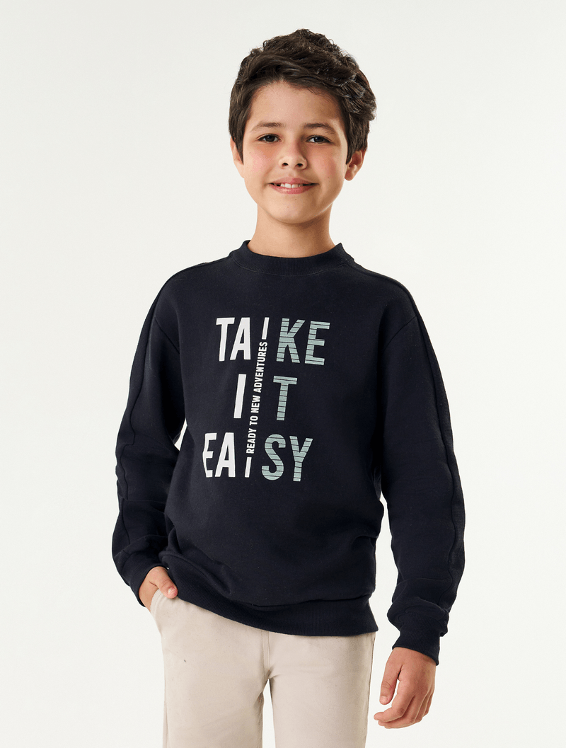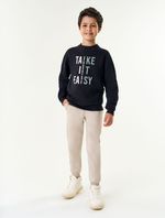 Blusão masculino em moletom felpado com estampa frontal e recortes nas mangas em ribana. Inverno 2024. Modelo veste tamanho 8 e possui 1 34 cm de altura.