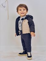 Body bebê masculino em cotton com gola transpassada para melhor vestir estampa frontal com detalhe de orelha 3D etiqueta clip na manga e abertura com botões. Inverno 2024. Modelo veste tamanho GG e possui 77 cm de altura.