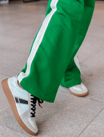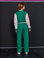 Calça wide leg juvenil feminino em moletom felpado com elástico e cadarço no cós, bolsos frontais e recorte lateral contrastante. Inverno 2024. Modelo veste tamanho 18 e possui 1,65 de altura.