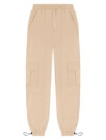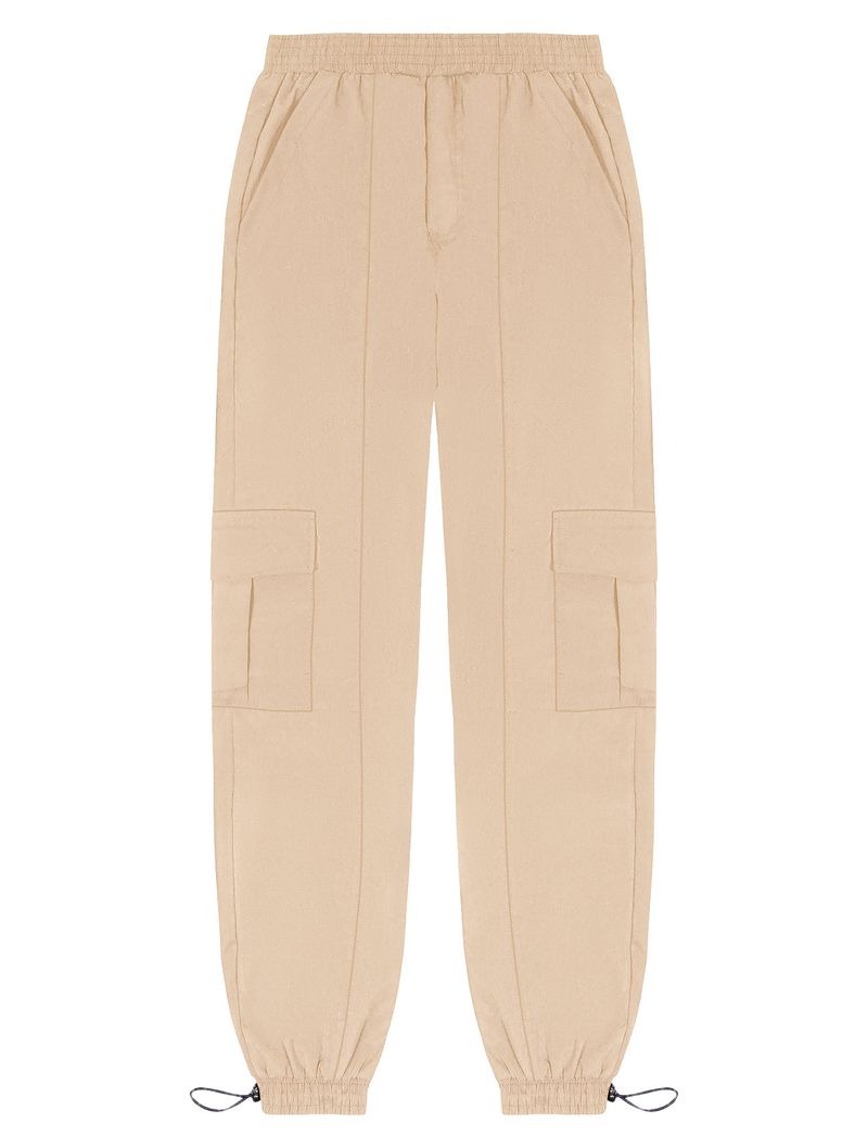 Calça jogger juvenil feminino em sarja skin touch com elástico no cós, bolsos frontais e nas laterais com lapela, braguilha falsa e punhos com elástico e regulador. Inverno 2024. Modelo veste tamanho 18 e possui 1,62 de altura.