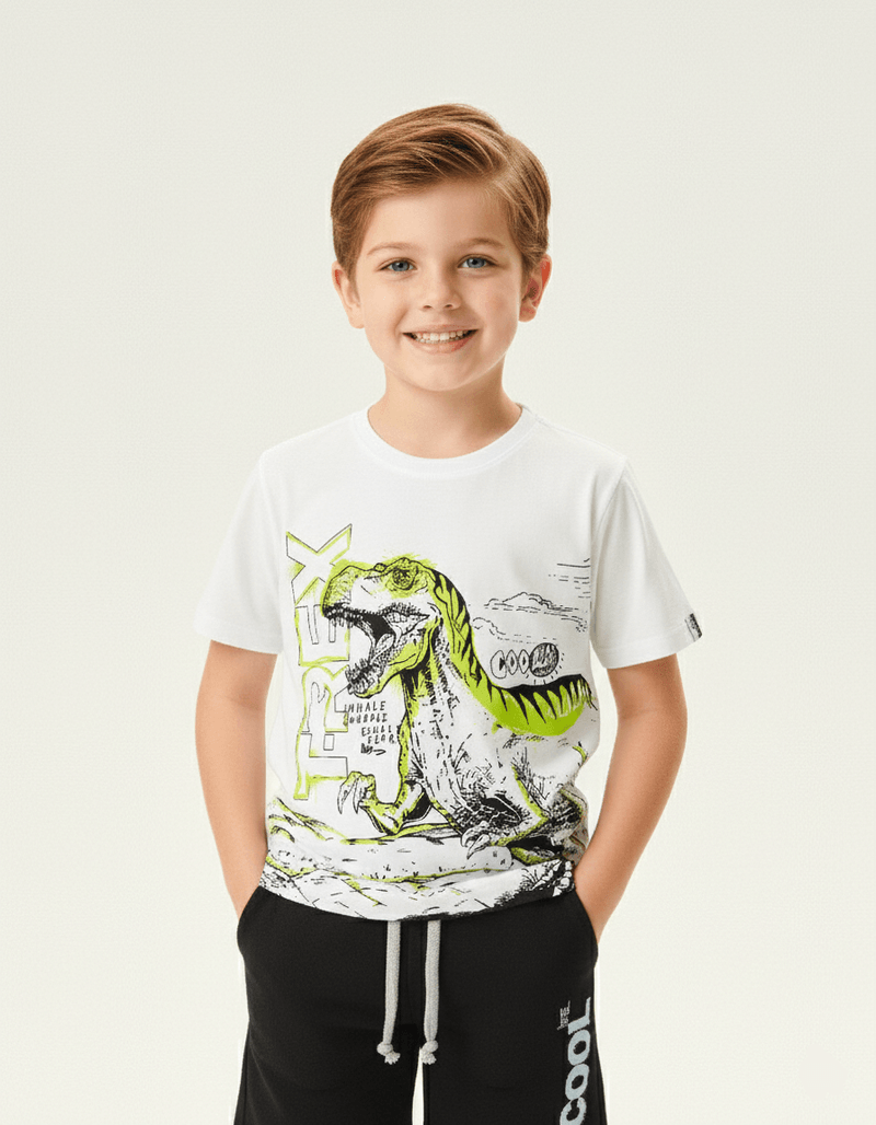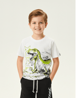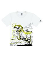 Camiseta masculina em meia malha com estampa super divertida de Dino frontal e costas e etiqueta decorativa na manga. Alto Verão 24. Modelo veste tamanho 4 e possui 1,10 de altura.