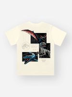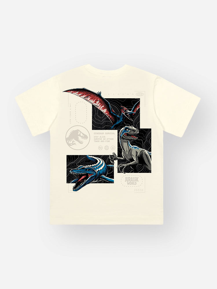O destaque fica por conta da estampa minimalista em relevo na altura do peito, com o icônico logo de Jurassic World e o lettering "Jurassic Basic Survival - Field Notes", como se fosse um uniforme oficial de exploradores da era jurássica. Nas costas, a emoção continua com uma estampa maximalista incrível, trazendo os dinossauros do ar, da terra e da água – uma representação completa do poder da natureza jurássica.