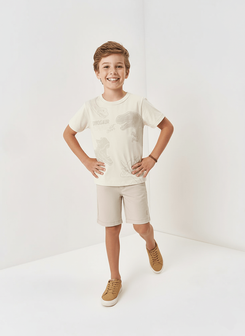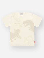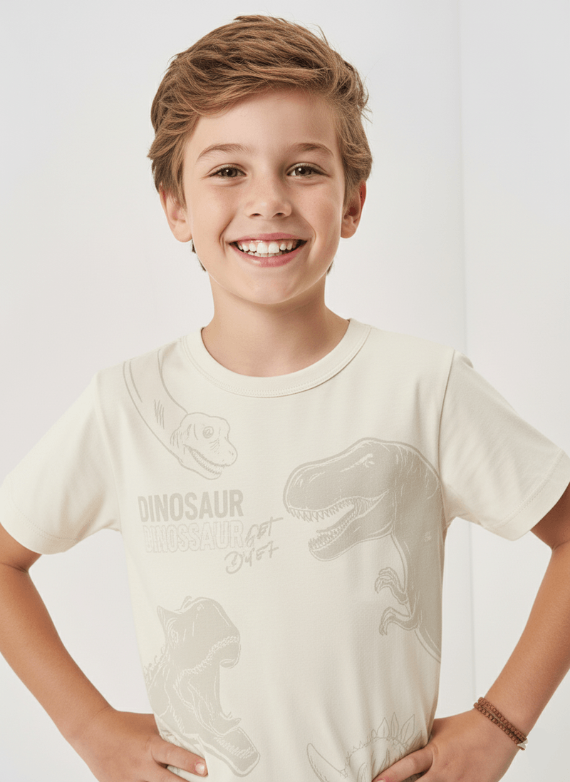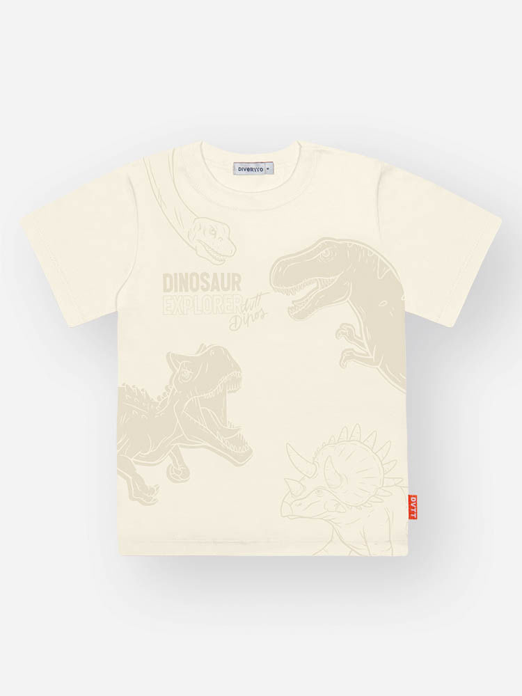 O grande destaque fica por conta da estampa de dinossauros, que aparece em diferentes espécies com detalhes em puff, criando um efeito divertido e cheio de personalidade. Disponível nas cores Natural e Laranja Energy, é uma peça versátil que combina facilmente com bermudas, calças ou jeans, compondo looks casuais e descontraídos.