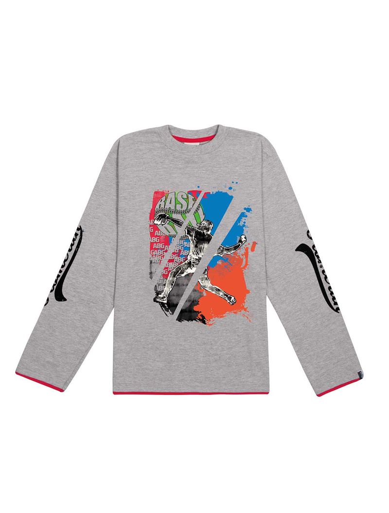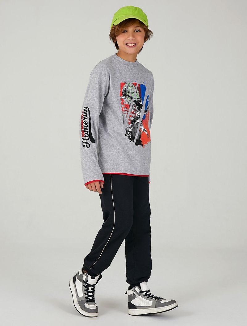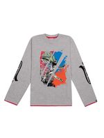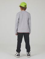 Camiseta em meia malha com estampa frontal e nas mangas, friso contrastante nos punho e barra e etiqueta decorativa no punho. Coleção Inverno 2023. Modelo veste tamanho 10. Tradução da estampa: Abg nascido para vencer / Homerum.