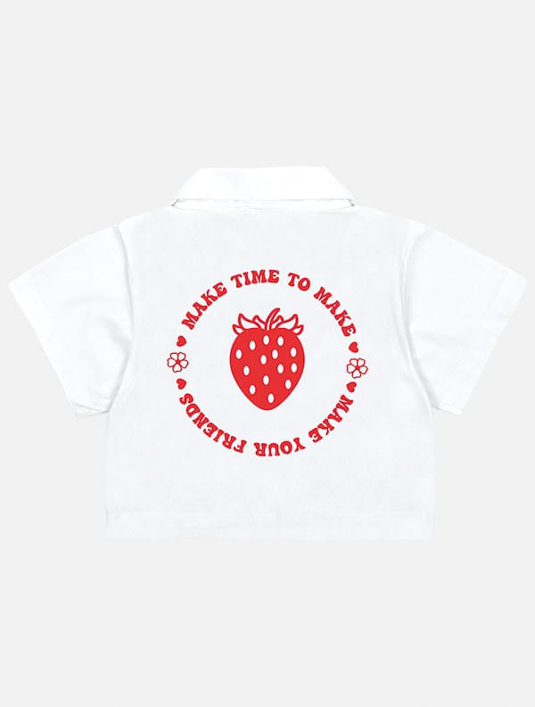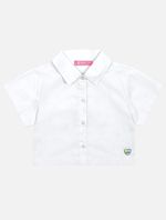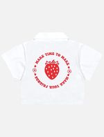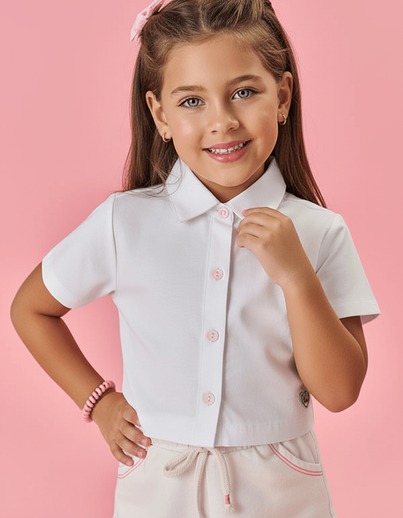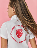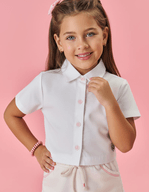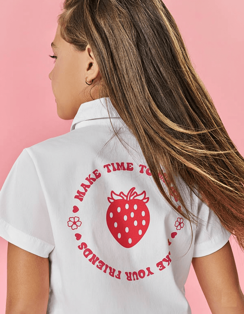 Camisa cropped em tricoline com elastano é perfeita para adicionar um toque de estilo ao guarda-roupa! Com gola clássica e abertura frontal em botões, ela oferece conforto e praticidade. A etiqueta decorativa próxima à bainha dá um charme extra ao visual. O destaque fica por conta da estampa puff nas costas, que exala um delicioso cheirinho de morango, tornando essa peça única e divertida. Ideal para compor looks descontraídos e cheios de personalidade, essa camisa é uma escolha irresistível para as pequenas fashionistas! Alto Verão 2024/2025. A modelo veste tamanho 6 e possui 1,22cm de altura.