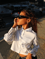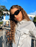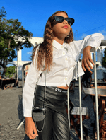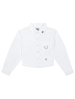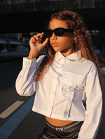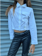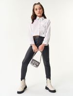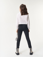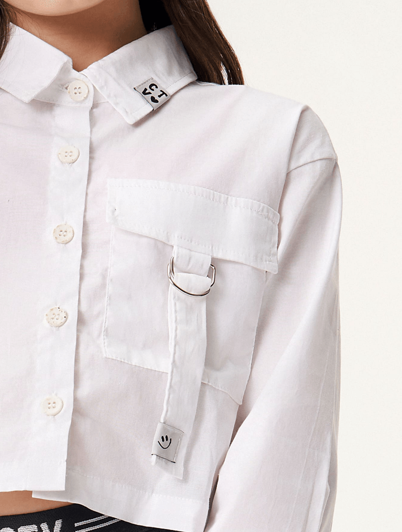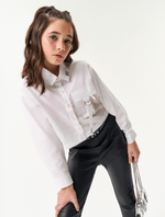 Camisa infantil feminina em tricoline em elastano com gola e etiqueta decorativa, abertura em botões, bolso com lapela, faixa com argola para fechamento e etiqueta clip decorativa, abertura com botão nos punhos para melhor vestir. Inverno 2024. Modelo veste tamanho 8 e possui 1,33 cm de altura.