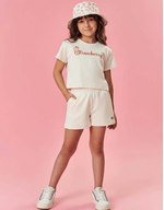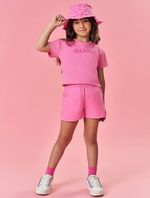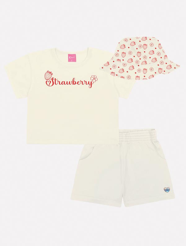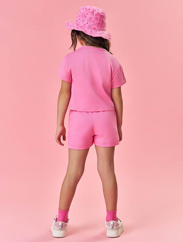 Conjunto perfeito para dias cheios de estilo! A blusa boxy em cotton apresenta uma estampa frontal vibrante, proporcionando conforto e liberdade de movimento. O short em sarja com elastano conta com cós elástico estilo clochard, bolsos frontais práticos e uma etiqueta decorativa próxima à bainha, garantindo um ajuste moderno e despojado. Para completar o look, o bucket em sarja com elastano possui forro e estampa total com cheirinho de morango, adicionando um toque divertido e alegre. Ideal para passeios e brincadeiras, este conjunto é uma escolha encantadora para as pequenas que adoram brilhar com estilo! Alto Verão 2024/2025. A modelo veste tamanho 6 e possui 1,20cm de altura.