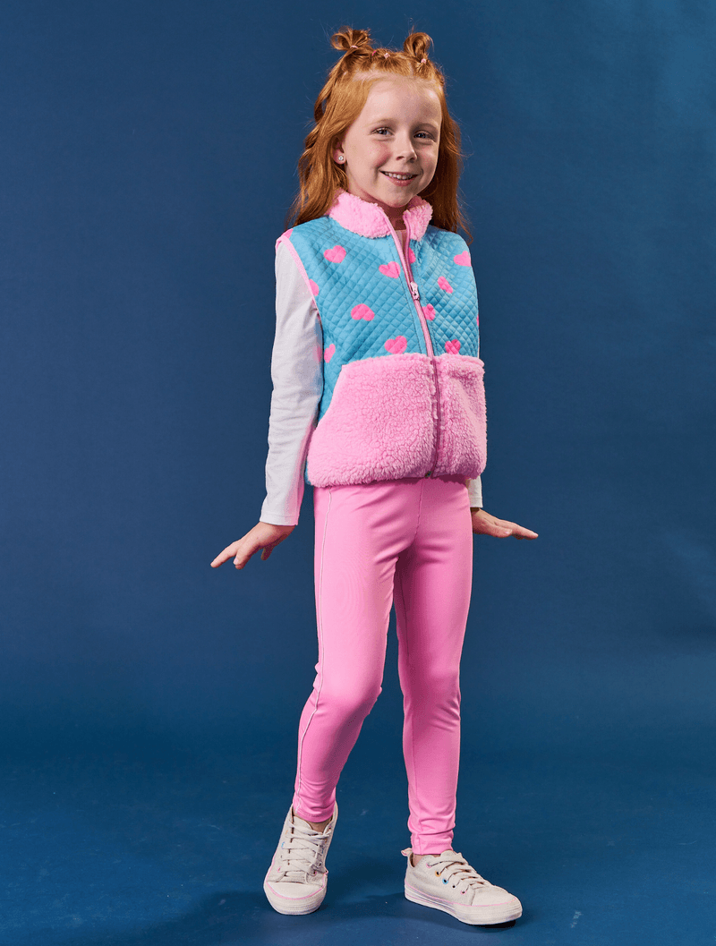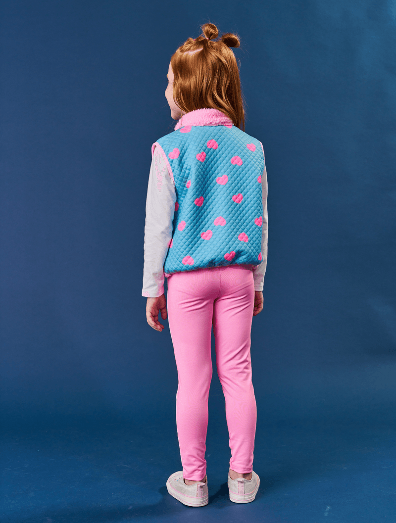 Conjunto feminino de blusa em meia malha com costas mais compridas estilo mullet legging em suplex com elástico no cós filete nas laterais e colete em matelassê estampado com gola e bolso em pelo carneirinho abertura em zíper e etiqueta decorativa no bolso. Inverno 2024. Modelo veste tamanho 4 e possui 1 12 de altura.