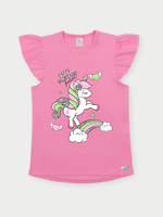 O destaque fica por conta da estampa divertida de unicórnio com glitter, cheia de cores vibrantes e detalhes fofos que encantam em qualquer ocasião. A bermuda listrada em tons alegres complementa o look com um ar moderno e descontraído.