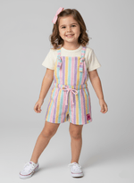 Conjunto feminino de blusa em ribana, jardineira em moletom linho com regulagem das alças em amarração, cadarço e elástico no cós, estampa total de listras e etiqueta próximo a bainha. Alto Verão 24. Modelo veste tamanho 4 e possui 1,05 de altura.
