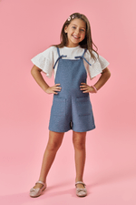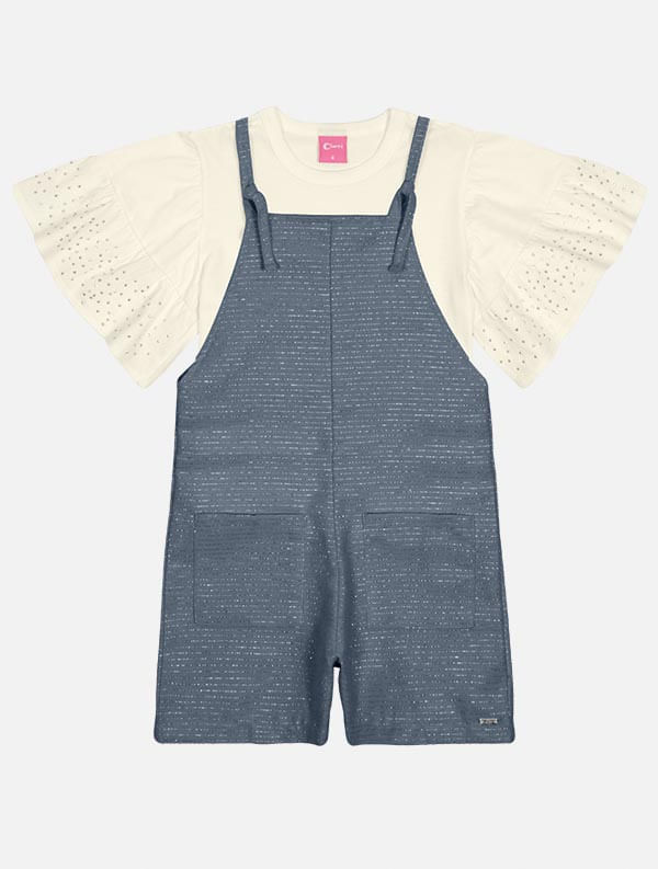 Conjunto inclui uma blusa em meia malha e uma jardineira em sarja glow, oferecendo um visual moderno e confortável. A blusa destaca-se pelo recorte nas mangas e detalhes em strass, que adicionam um brilho sutil e sofisticado ao design. A jardineira, feita em sarja glow, é prática e estilosa, com alças ajustáveis em nó para um ajuste personalizado. Os bolsos frontais são funcionais e complementam o visual com um toque de estilo adicional. Próxima da bainha, uma plaquinha decorativa adiciona um detalhe elegante e refinado. Alto Verão 2024/2025. A modelo veste tamanho 6 e possui 1,22cm de altura.