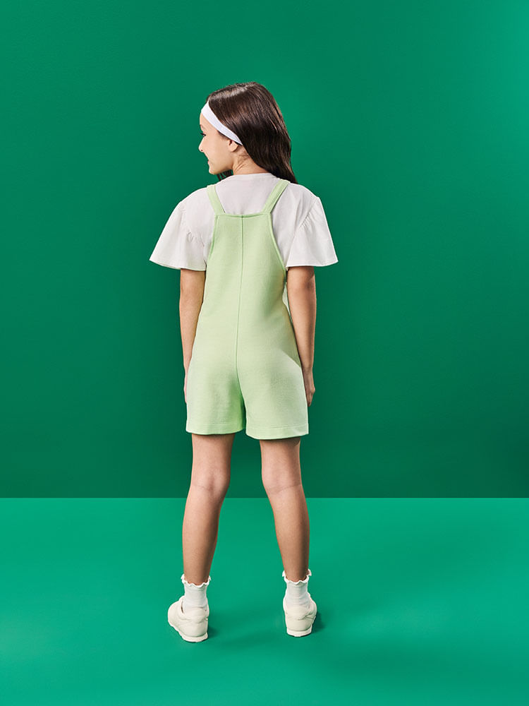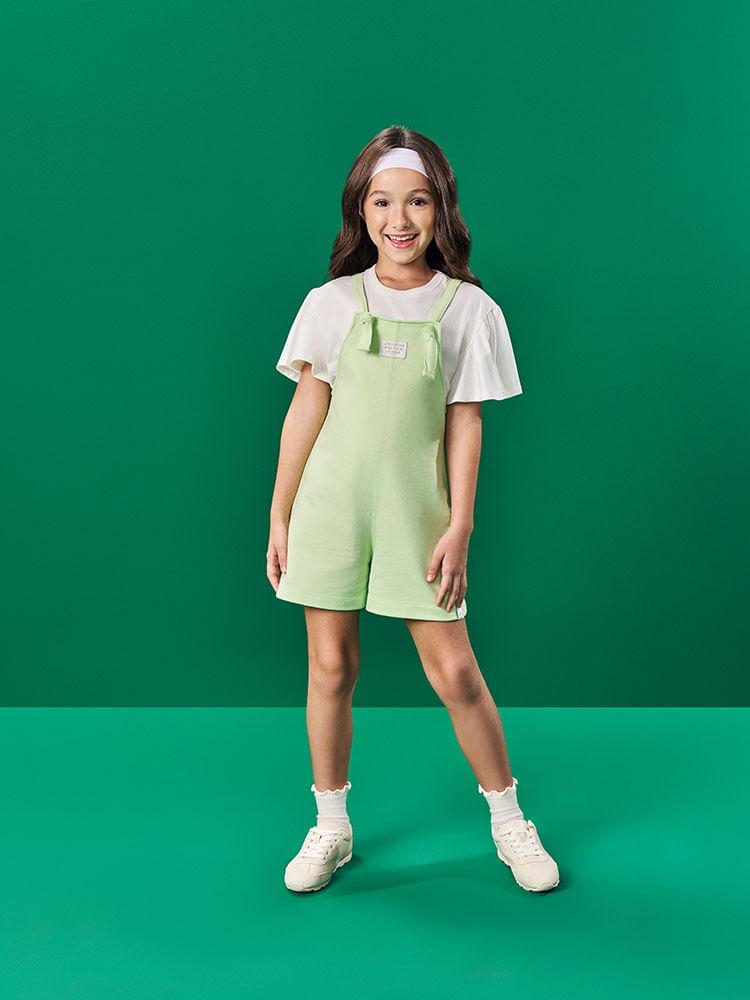 A jardineira é feita em moletom com 77% algodão e 23% poliéster, oferecendo estrutura suave, resistência e um toque aconchegante. O tecido possui boa maleabilidade e elasticidade natural, permitindo que a criança brinque e se movimente sem restrições. Os detalhes em alças ajustáveis com amarração dão um toque especial e facilitam o vestir.