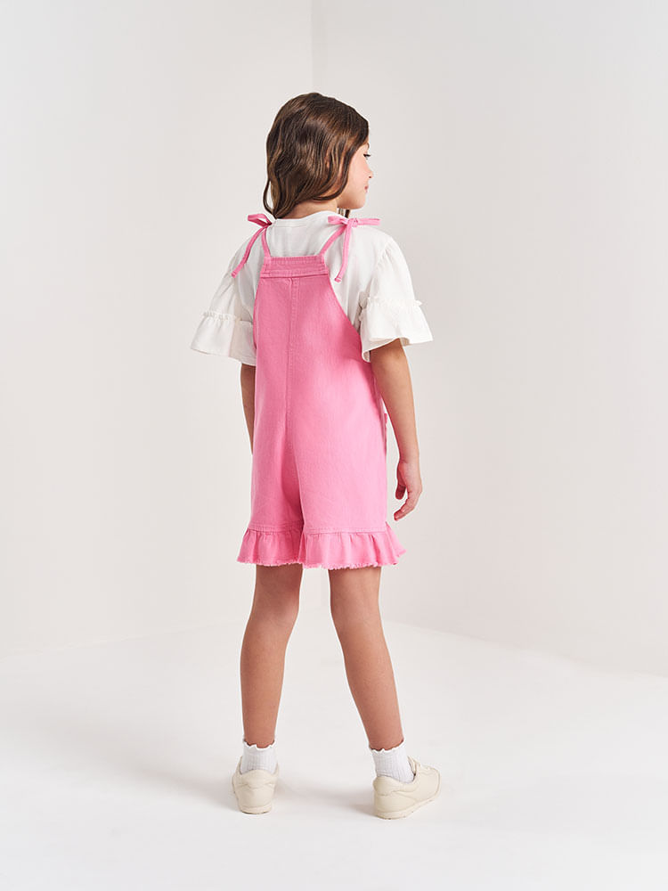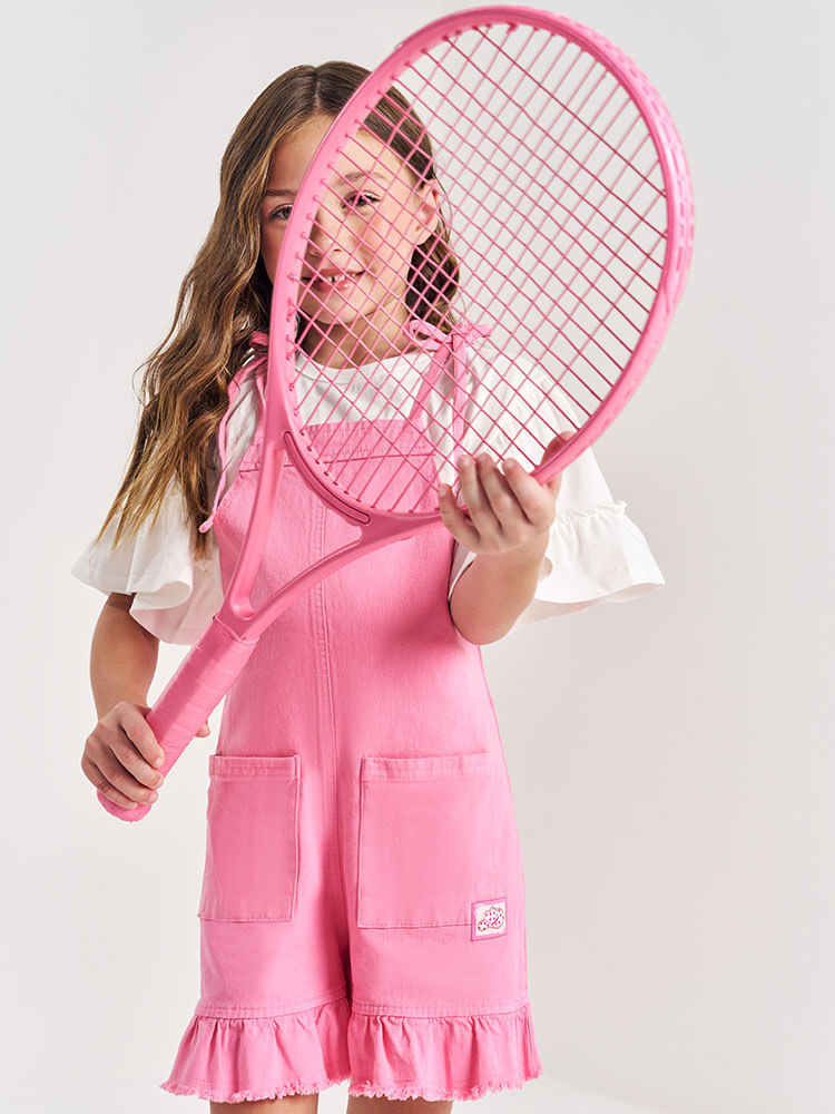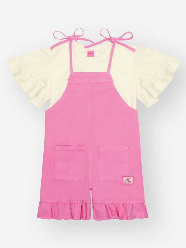 A jardineira em sarja com elastano (98% algodão e 2% elastano) combina a resistência e firmeza do algodão com a elasticidade do elastano, resultando em uma peça confortável, com maleabilidade que acompanha os movimentos da criança sem apertar. O tecido tem toque suave, estrutura encorpada e caimento moderno, com destaque para os detalhes de laço nos ombros, bolsos frontais e babados na barra, que deixam o visual ainda mais gracioso.