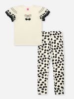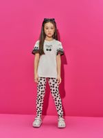 Estilo e conforto para todos os momentos! Esse conjunto é composto por blusa alongada confeccionada em meia malha macia e respirável, com estampa exclusiva e mangas franzidas com detalhes em sublimação que trazem um toque fashion ao visual. O toque do tecido é suave e agradável, ideal para acompanhar as meninas em atividades do dia a dia com liberdade de movimentos.