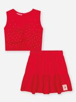 O conjunto é a escolha perfeita para as meninas que amam unir estilo e conforto em um look só. A blusa cropped possui aplicação delicada de strass furtacor, que traz brilho sutil e sofisticado, enquanto a saia-short garante liberdade de movimento para brincar e se divertir, sem perder o charme.