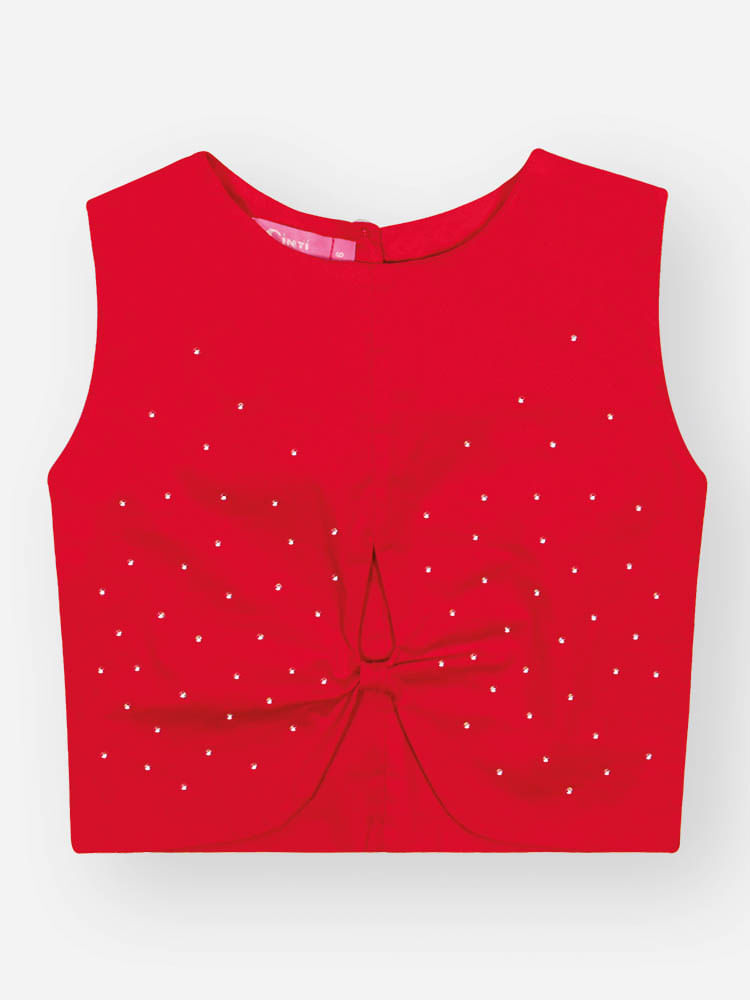 Blusa Cropped confeccionada em tricoline com elastano (97% algodão e 3% elastano), apresenta toque suave na pele, caimento leve e a elasticidade ideal para acompanhar os movimentos da criança. O detalhe com recorte frontal e o brilho do strass tornam a peça ainda mais especial.
