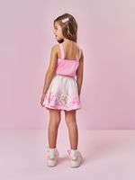 A saia-short traz a sofisticação do super cetim (100% poliéster), que confere leve brilho acetinado e toque sedoso, acompanhado de shorts interno em algodão (100%), que oferece conforto e segurança extras para brincar à vontade.