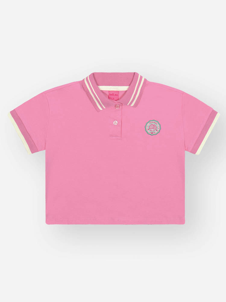A Blusa Polo em Meia Malha é a peça central, trazendo a modelagem Boxy que é sinônimo de modernidade. O destaque são os detalhes de frisos contrastantes em retilínea na gola e nas mangas, que remetem aos uniformes das universidades americanas. O fechamento com botão e a etiqueta decorativa termocolante (patch) no peito complementam o charme.