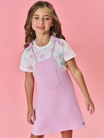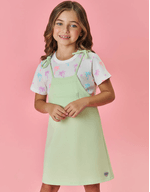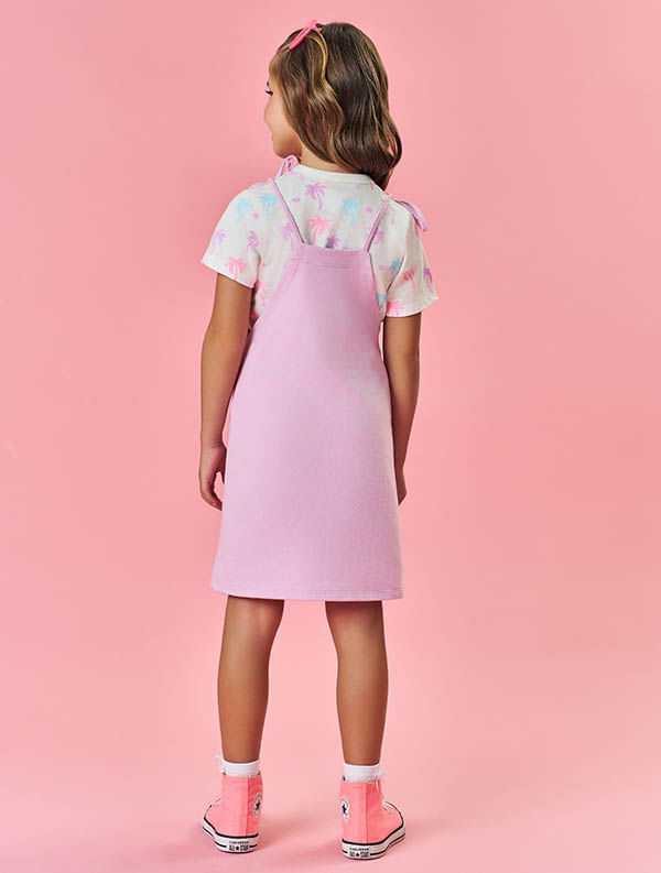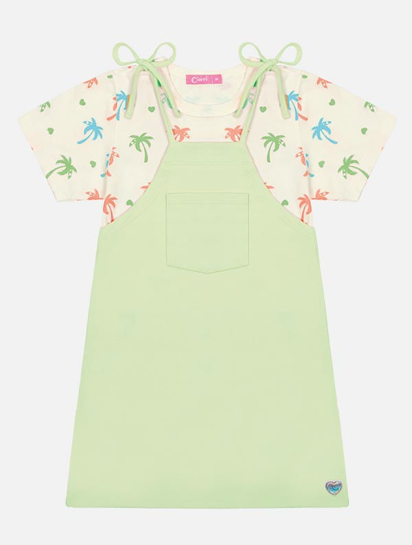 Conjunto inclui uma blusa em meia malha com estampa total de coqueiros, trazendo um visual alegre e tropical. A blusa combina perfeitamente com a salopete em molecotton jeans, que oferece um estilo casual e confortável. A salopete é destacada pelos laços nas alças, adicionando um toque feminino e divertido. Um bolso no peito oferece praticidade e um detalhe adicional, enquanto a etiqueta decorativa próxima da bainha confere um charme sutil e elegante ao design. Alto Verão 2024/2025. A modelo veste tamanho 6 e possui 1,22cm de altura.