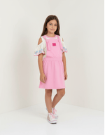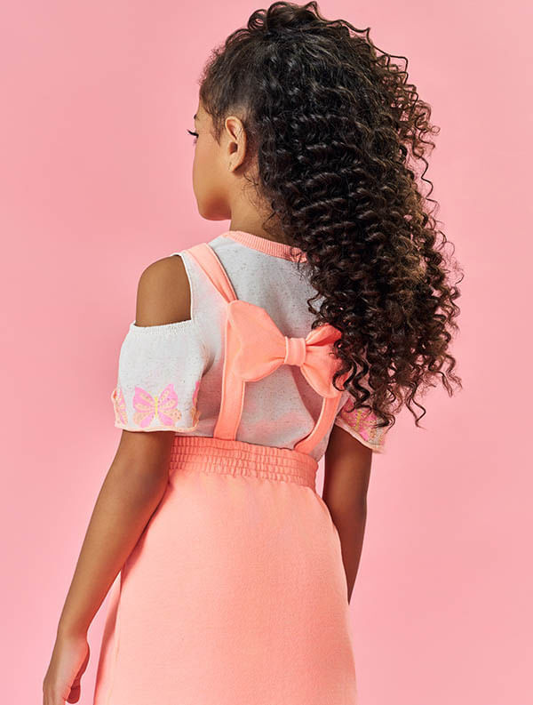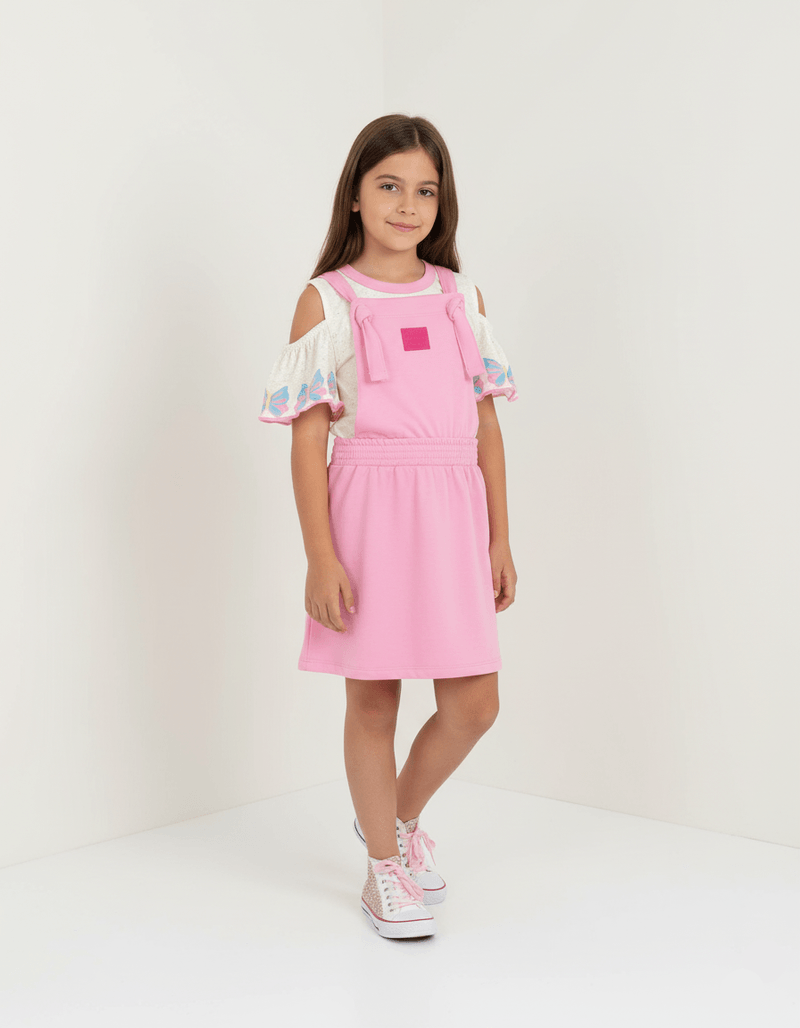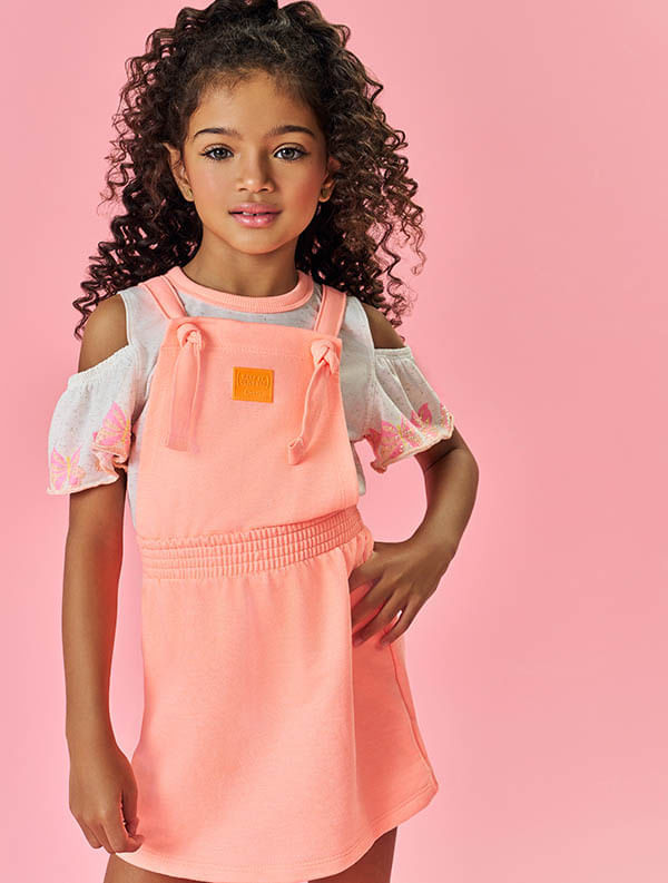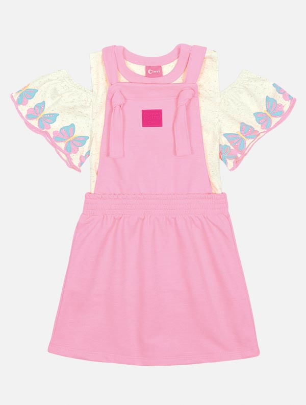 Conjunto que combina uma blusa em cotton linho com uma salopete em moletom para um visual adorável e confortável. A blusa apresenta um decote contrastante e uma abertura nos ombros, além de mangas decoradas com estampa de borboletas, strass e frufru, adicionando um toque divertido e delicado. A salopete em moletom é prática e estilosa, com a possibilidade de ajustar as alças em nó para um ajuste personalizado. No peito, uma etiqueta decorativa oferece um detalhe sutil e elegante. A cintura é ajustada com elástico, garantindo conforto, e nas costas, um detalhe de laço em formato de borboleta proporciona um charme adicional. Alto Verão 2024/2025. A modelo veste tamanho 6 e possui 1,20cm de altura.