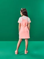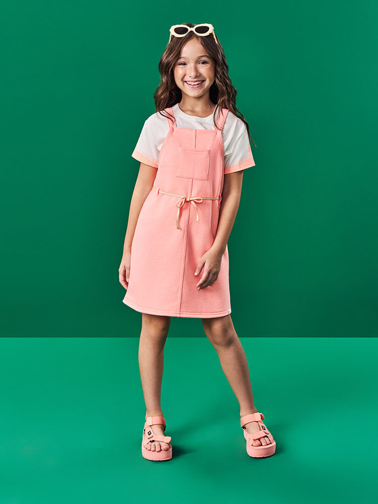 A estrela do conjunto é a Salopete em Moletom de modelagem trapézio, que oferece um caimento leve e confortável. Ela possui um bolso frontal estilo canguru com pesponto de beira, alças com frisos e botões pintadinhos internos para ajuste. O cadarço chato funcional na cintura permite um ajuste acinturado e personalizado, finalizado com um travete elegante.