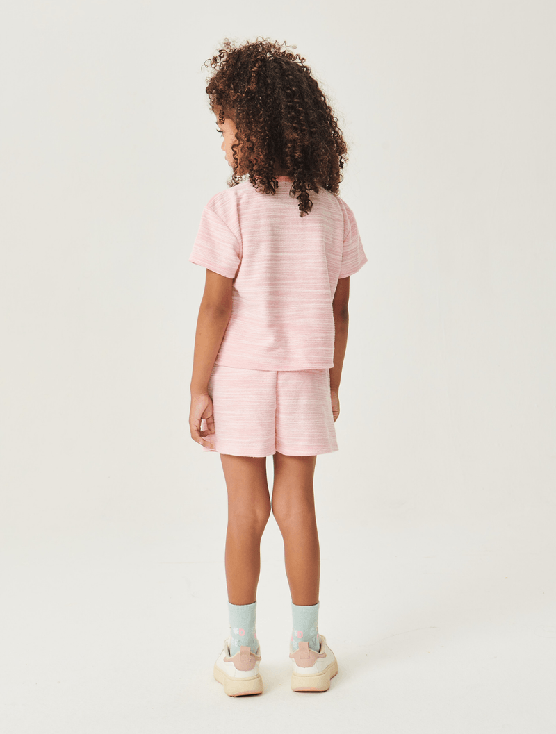 Conjunto blusa em moletinho atoalhado com recorte com estampa e strass, short em moletinho atoalhado com elástico e cadarço decorativo no cós, bolsos com recorte e etiqueta decorativa próximo da bainha. Primavera 2023. Modelo veste tamanho 4 e possui 1,11 de altura.