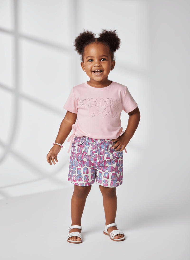 Conjunto blusa em meia malha com strass frontal, detalhe nas laterais com abertura e laço, short em moletom linho com elástico e cadarço decorativo no cós, estampa total e etiqueta decorativa próximo da bainha. Primavera 2023. Modelo veste tamanho 4 e possui 1,04 de altura.